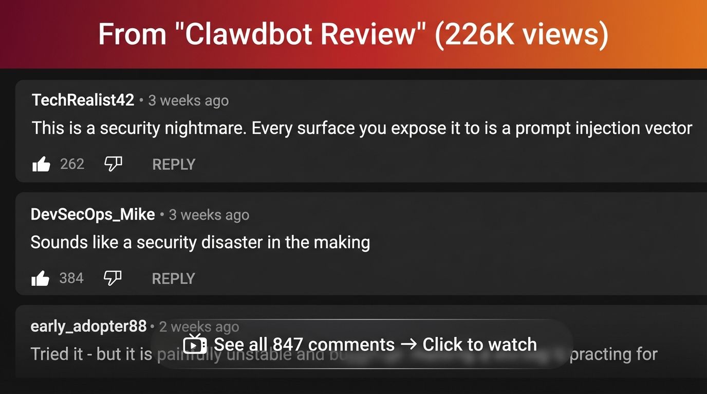 Prompt injection risk — one malicious email could hijack the AI while it has full desktop access